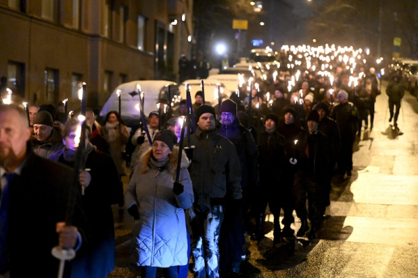 The nationalist 612 torch march in Helsinki on Independence Day, 6 December 2024. The organisers claim the march is politically neutral, but in previous years it has attracted nationalist and far-right groups. LEHTIKUVA
