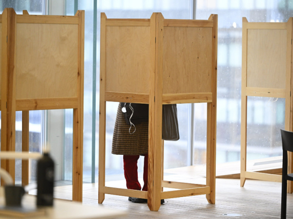 A voter in a polling booth in Central Library Oodi in Helsinki on Monday, 22 January 2024. The advance voting period saw a total of 1.88 million people exercise their right to vote, representing a marked increase in turnout from the presidential elections held in 2018. (Antti Aimo-Koivisto – Lehtikuva)