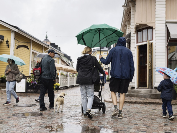 Pedestrians in rainy Porvoo on 3 July 2024. Balmy weather is expected to make a comeback in Finland, with a small high-pressure front forming over the country clearing the skies and pushing up temperatures at least in southern parts of the country as of Wednesday. (Roni Rekomaa – Lehtikuva)