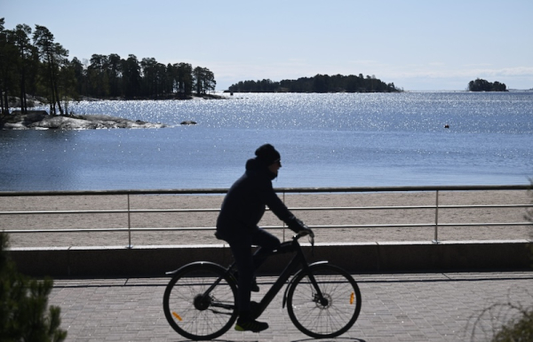 A cyclist on a sunny spring day in Aurinkolahti, Vuosaari, Helsinki on 5 May 2025. Photo: Vesa Moilanen / Lehtikuva