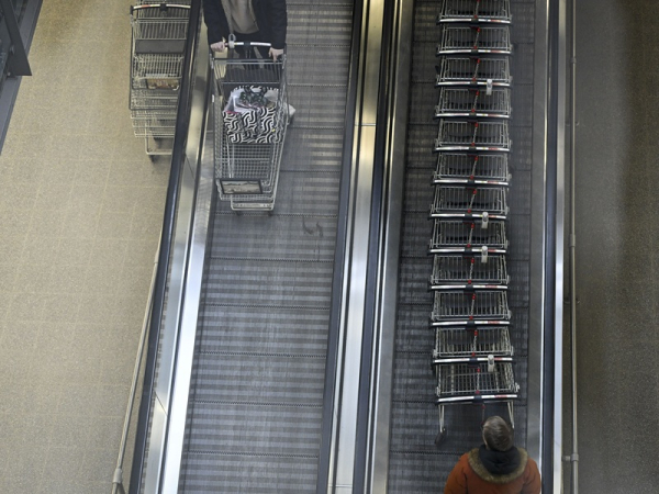 People and shopping carts on an escalator in Sello Shopping Centre in Espoo, Southern Finland, on Saturday, 15 February 2025. The Finnish government has overstated the economic challenges facing the country, giving rise to a public sentiment that is detached from the economic reality, argue three economists interviewed by Helsingin Sanomat. (Emmi Korhonen – Lehtikuva)