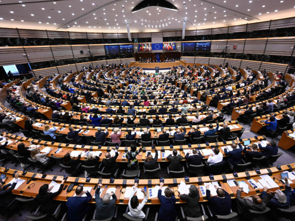 Members of the European Parliament took part in a series of votes during a plenary session in Brussels on Wednesday, 10 April 2024. The lawmakers, somewhat surprisingly, approved a long-debated pact on measures to expedite asylum and security procedures at the external borders of the 27-country bloc. (John Thys – AFP / Lehtikuva)
