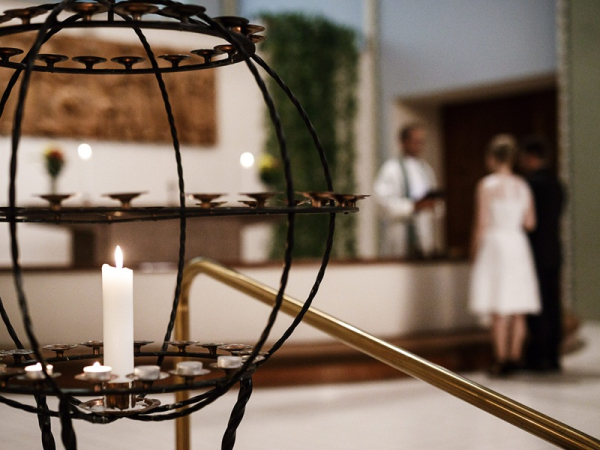 A couple at the altar during an overnight mass wedding ceremony at Kallio Church in Helsinki in August 2018. Statistics Finland is forecasting based on marriage statistics from last year that fewer than half of Finns will get married before turning 50. (Roni Rekomaa – Lehtikuva)