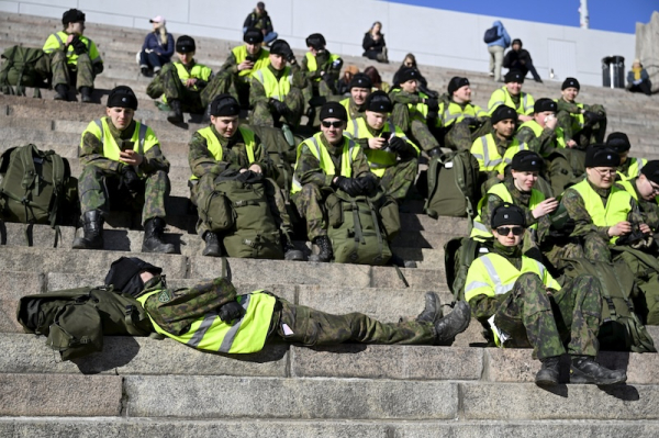 Finnish conscripts enjoy the sun on the stairs of the Helsinki Cathedral on Wednesday, 19th Marcuh, 2025. / lehtikuva