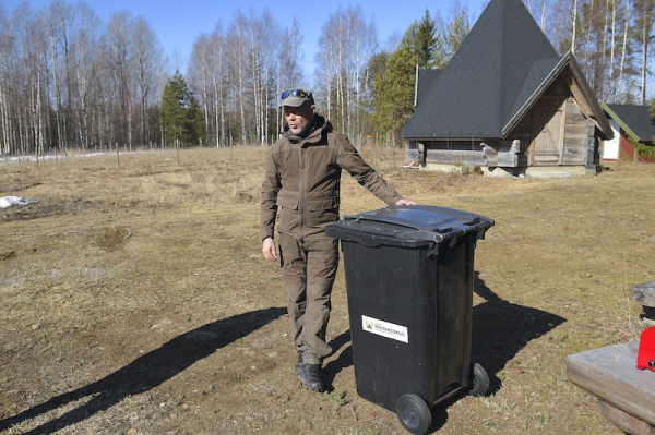 Kai-Eerik Nyholm and a bear-resistant waste container. Photo: Juha Tissari / Finnish Wildlife Agency