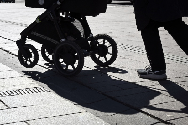 Stroller being pushed outside in Helsinki on a sunny day. Photo: Emmi Korhonen / Lehtikuva
