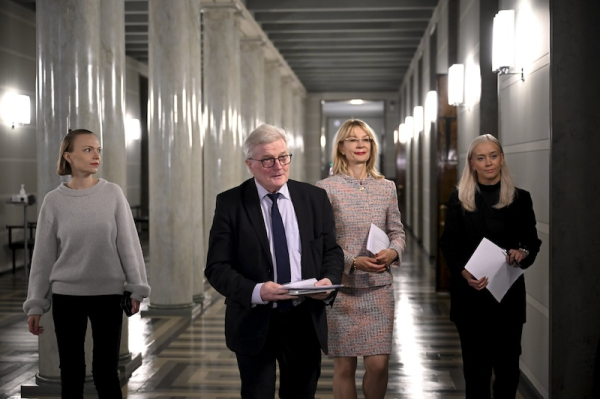 Chair of the Left Alliance Minja Koskela, Chair of Parliament’s Foreign Affairs Committee Johannes Koskinen, Chair of the SDP parliamentary group Tytti Tuppurainen, and Chair of the Green Party Sofia Virta (right) submitting a motion of no confidence at Parliament’s Central Office in Helsinki on 19 September 2025. Photo: Markku Ulander / Lehtikuva