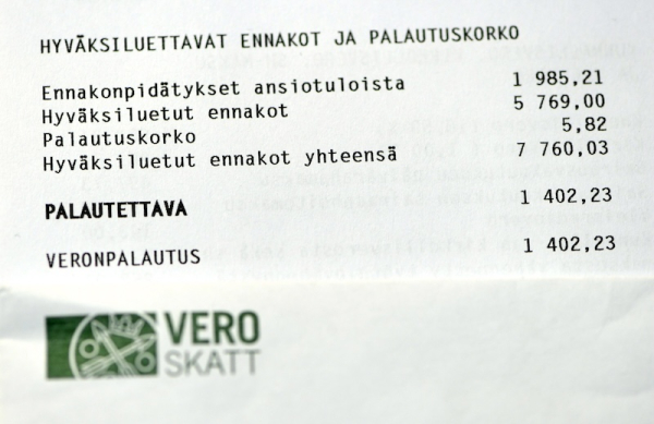 Detail from the tax card of a person receiving over 1,000 euros in tax refunds. Photo: Vesa Moilanen / Lehtikuva