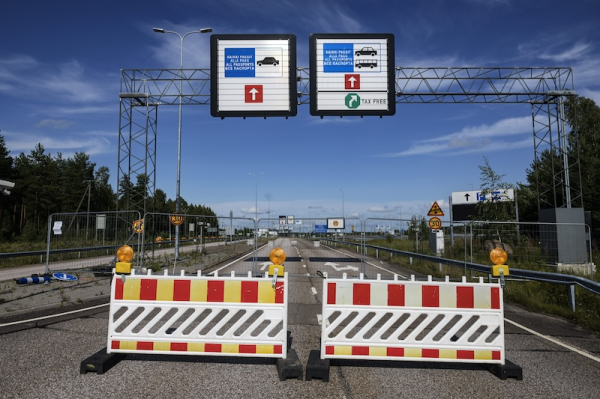 Closed road leading to the closed Vaalimaa border check point between Finland and Russia is seen in Virolahti, Finland, on July 18, 2024. LEHTIKUVA