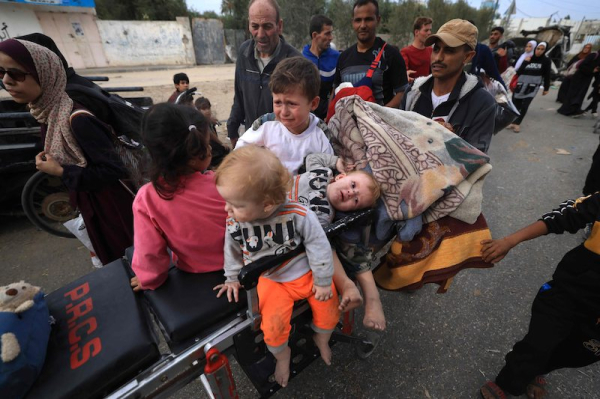 Palestinians arrive south of Gaza City on November 12, 2023, after fleeing their homes in Gaza City and the Northern Gaza Strip amid the ongoing battles between Israel and the Palestinian group Hamas. LEHTIKUVA / AFP