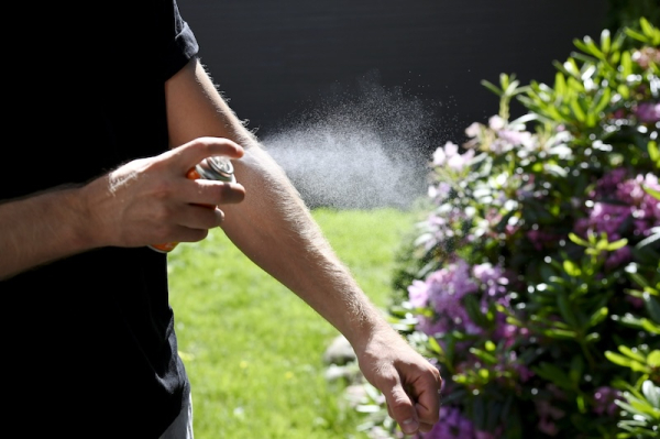 Man spraying mosquito repellent. LEHTIKUVA