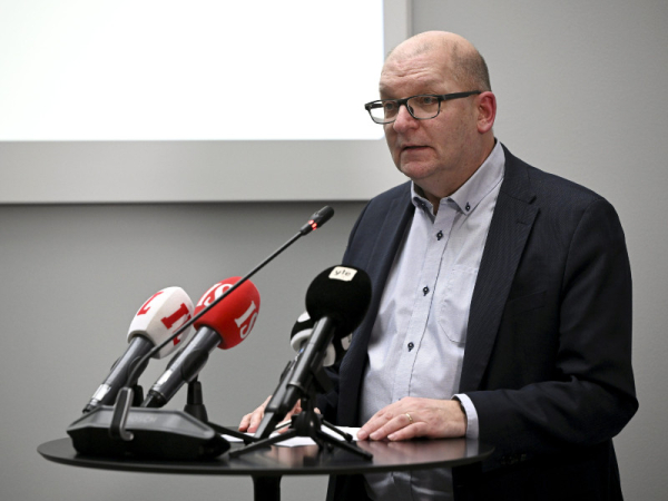 Riku Aalto, the chairperson of the Finnish Industrial Union, addressed members of the media at a news conference in Helsinki on 20 March 2024. Aalto on Thursday accused the government of pursuing spending cuts that will condemn almost 120,000 people to poverty. (Antti Aimo-Koivisto – Lehtikuva)