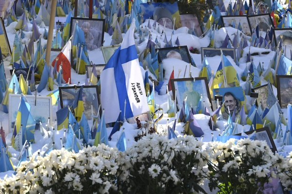 Finnish flag marks for fallen Finnish foreign fighter at Independence Square Maidan in Kyiv, Ukraine. LEHTIKUVA