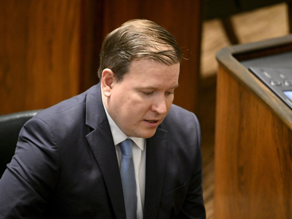 Minister for Foreign Trade and Development Ville Tavio (PS) attended a plenary session in the Parliament House in Helsinki on 27 September 2024. Tavio on Wednesday survived an interpellation brought over his decision to forgo participation in a global alliance promoting gender-responsive and inclusive recovery in Ukraine. (Vesa Moilanen – Lehtikuva)