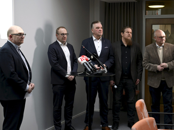 Chairpersons Riku Aalto of the Industrial Union, Jarkko Eloranta of the Central Organisation of Finnish Trade Unions, Sauli Väntti of the Electrical Workers’ Union, Ismo Kokko of the Transport Workers’ Union (AKT) and Håkan Ekström of the Trade Union for the Public and Welfare Sectors (JHL) spoke to reporters in Helsinki on 20 March 2024. (Antti Aimo-Koivisto – Lehtikuva)