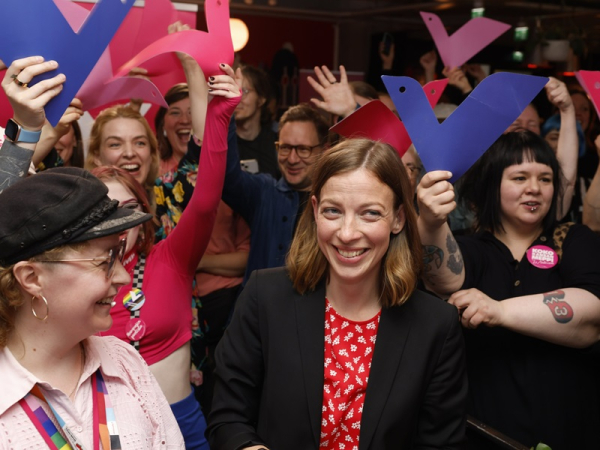 Li Andersson, the outgoing chairperson of the Left Alliance, smiled surrounded by her party comrades at the election night even of the left-wing opposition party in Helsinki on 9 June 2024. Her nationwide personal appeal enabled the opposition party to stage perhaps the biggest surprise of the European elections in Finland, a three-seat tally in Brussels. (Roni Rekomaa – Lehtikuva)