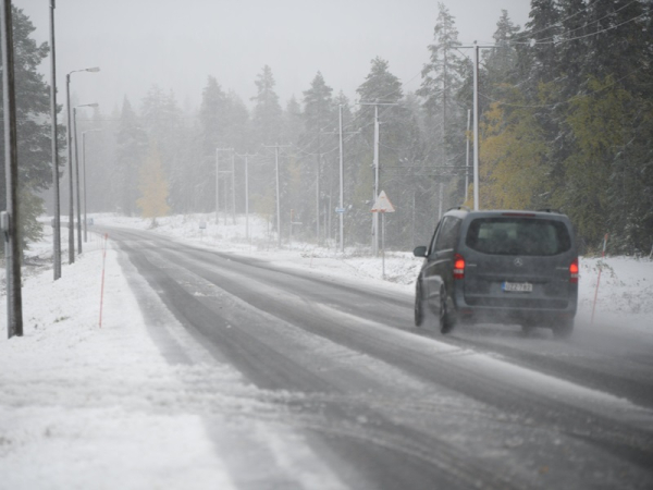 A car on a road in Kolari, Finnish Lapland, in September 2023. The Finnish Meteorological Institute (FMI) has issued a warning of challenging road conditions to motorists in many parts of Central and Southern Finland. FMI is forecasting that many in the regions will wake up today to see the ground covered in snow. (Irene Stachon – Lehtikuva)