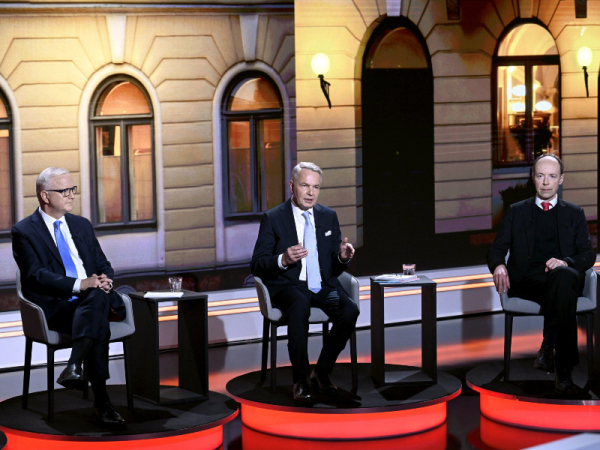 Presidential candidates Olli Rehn (Centre), Pekka Haavisto (Greens) and Jussi Halla-aho (PS) attended an election debate hosted by MTV in Helsinki on Wednesday, 24 January 2024. Halla-aho stood out from the other candidates with his assessment about President Sauli Niinistö’s decision to publicly comment on the racism-related coalition crisis witnessed last summer. (Markku Ulander – Lehtikuva)
