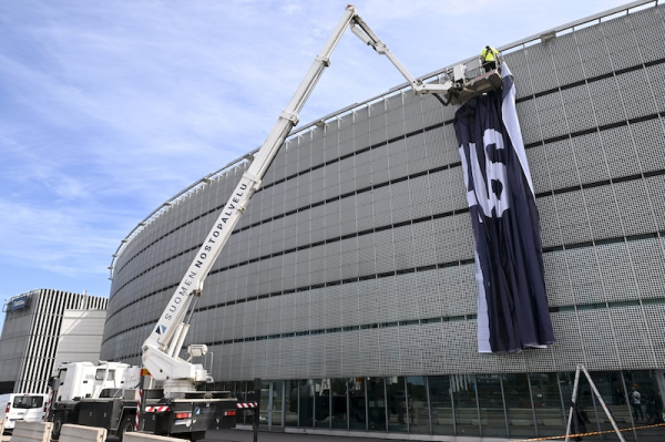 Preparations began in front of the arena to hang a banner before the official name sign is completed. Photo: Mikko Stig / Lehtikuva