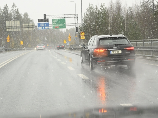 Sleet seen through the windscreen of a car on Ring Road 2 in Espoo on 3 November 2024. The Finnish Meteorological Institute (FMI) is forecasting heavy snowfall, including possibly blizzard-like conditions, for southern and central areas of Finland starting on Wednesday. (Heikki Saukkomaa – Lehtikuva)