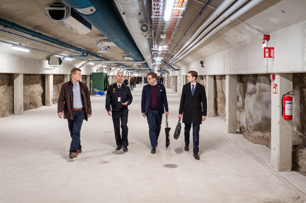 Project Managers Tuomo Kinnunen (left) and Risto Ainasoja discuss the renovation of the Niemenmäki civil defense shelter with Deputy Mayor Daniel Sazonov. Next to them is Sazonov’s assistant, Jeremias Nurmela. Photo: Helsinki City Fire Department.