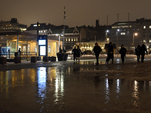Pedestrians braved ice, slush and puddles in rainy Helsinki on Friday, 16 February 2024. The Finnish capital reported last week that its population grew by almost 11,000 between 2022 and 2023, representing the first increase of over 10,000 since the urban expansion of the 1960s. (Emmi Korhonen – Lehtikuva)