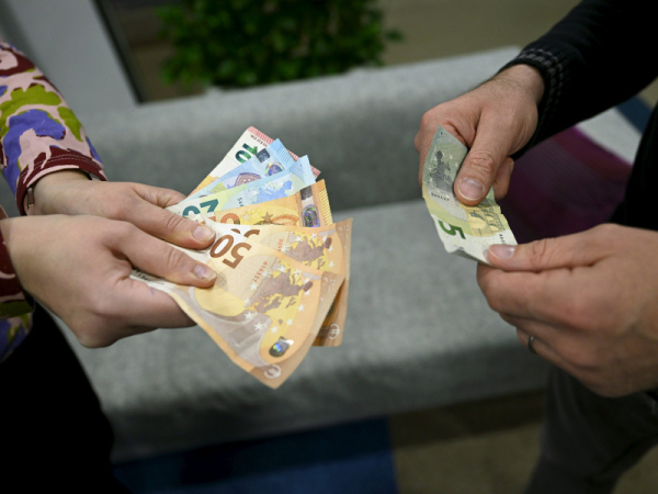 A file photo of two people holding banknotes. Helsingin Sanomat has written about current and former employees of the City of Helsinki who have had to look into discrepancies in their payslips and wages for as long as 18 months. (Vesa Moilanen – Lehtikuva)