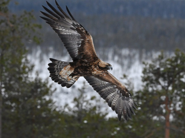 A golden eagle in Kuusamo, North Ostrobothnia, in March 2022. Helsingin Sanomat on Monday reported that the Ministry of the Environment has shelved a report laying out the adverse effects of wind farms on the golden eagle, citing the painstaking nature of finalising the report based on comments from stakeholders. (Jussi Nukari – Lehtikuva)