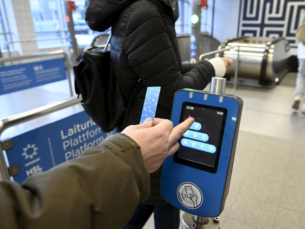 A card reader at the metro station in Ruoholahti, Helsinki, in January 2023. Helsinki Region Transport on Tuesday announced it is raising public transport fares by an average of eight per cent in 2025, after an unsuccessful attempt to increase passenger volumes by cutting the fares for this year. (Jussi Nukari – Lehtikuva)