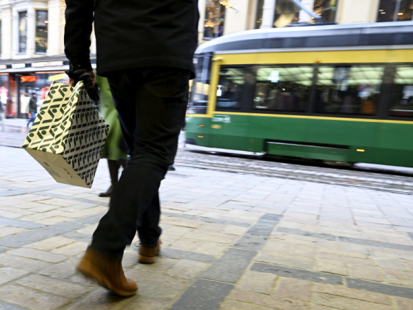 A person with a shopping bag on Aleksanterinkatu in Helsinki on 23 December 2023. Data from Statistics Finland reveal that consumer prices rose by 3.6 per cent year-on-year in December, signalling an increase of 0.3 percentage points from November. (Vesa Moilanen – Lehtikuva)