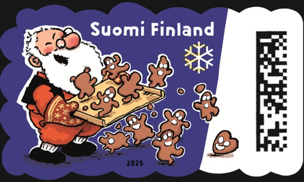 “In the no-value indicator stamp for Christmas greetings, the gingerbreads are jamming wildly on a hot baking tray. In the domestic no-value indicator stamp, the gingerbreads are a little calmer and are singing in a Christmas choir led by Santa Claus,” said Kunnas.