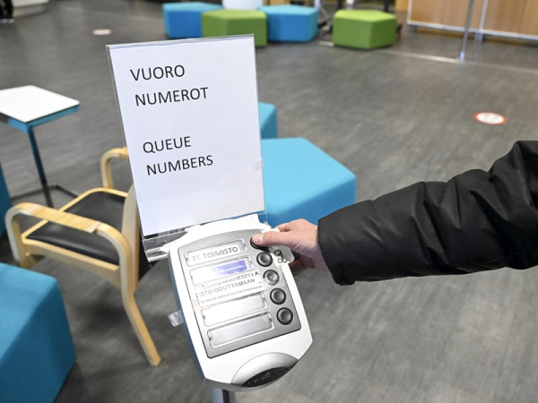 A client at the queue ticket machine of a TE Office in Pasila, Helsinki, in March 2023. Three months is simply not enough to find a job in Finland, view the vast majority of individuals and organisations that commented on a government proposal to introduce a three-month re-employment requirement for work permit holders. (Vesa Moilanen – Lehtikuva)
