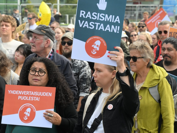 People demonstrated against racism and fascism in Helsinki on 3 September 2023. A survey by the Finnish Business and Policy Forum (EVA) shows that Finns widely think that racism should not be tolerated, while being split over how prevalent a problem racism is in the country. (Jussi Nukari – Lehtikuva)
