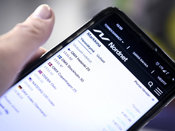 A person examining stock market indices on a smartphone in Helsinki in November 2020. Nordnet could face an administrative penalty payment worth millions of euros depending on the scope of the technical incident that allowed some customers to access the personal details, savings accounts and investment portfolios of others on Tuesday, 11 February 2025. (Emmi Korhonen – Lehtikuva)