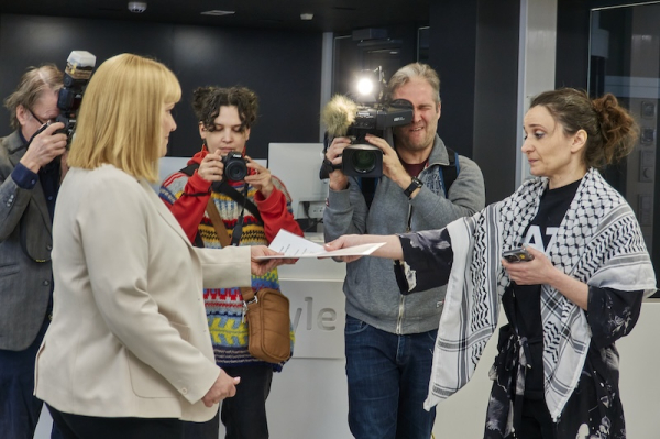 The cultural sector petition was handed to Johanna Törn-Mangs, Yle’s Editor-in-Chief for Creative Content and Media, by a group of prominent artists. These included actors Noora Dadu and Malla Malmivaara, musicians Nemat Battah, Paleface, Pehmoaino, Melo, Lxandra and Miikka Koivisto, journalists Susani Mahadura and Ina Mikkola, DJ Daniel Shaya, and dancer Sonya Lindfors. The public petition was presented by Lili De Paola on behalf of Sumud.