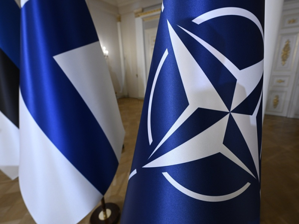 The Finnish and Nato flags at the scene of a press conference held after a summit of Baltic Sea Nato countries in the Presidential Palace in Helsinki on 14 January 2025. A study by Finland Promotion Board reveals that Finnish foreign and security policy was of particular interest to international media outlets in 2024. (Vesa Moilanen – Lehtikuva)