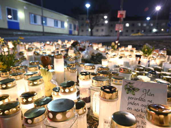 Candles and flowers outside the Jokiranta campus of Viertola Comprehensive School in Vantaa on 8 April 2024. Eastern Uusimaa Police Department on Wednesday said it is close to wrapping up its investigation into the deadly shooting that took place in a classroom on the campus on 2 April. (Heikki Saukkomaa – Lehtikuva)