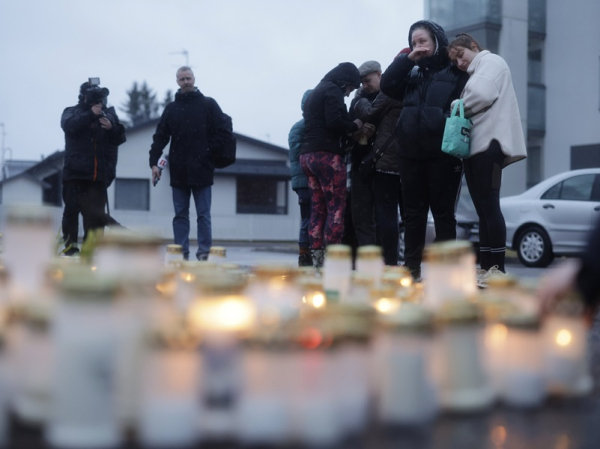 Candles, flowers, mourners and members of the media outside the Viertola school in Vantaa, Southern Finland, on 2 April 2024. Eastern Uusimaa Police Department communicated last week that its officers have wrapped up their pre-trial investigation into a shooting at the school that left one pupil dead and two seriously injured. (Roni Rekomaa – Lehtikuva)