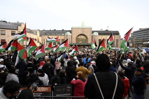 Throughout the demonstration, various chants were echoed by the crowd in Finnish, English, and Arabic, such as “Hey hey, ho ho, occupation got to go!” and “Free, free Palestine!” Palestinian flags were notably visible, and many held signs portraying Israel as a terrorist state and calling for peace for civilians.