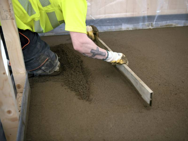 A construction worker spreading wet concrete at a single-family house construction site in Helsinki in April 2022. The slowdown in residential construction is casting one of the darkest clouds on the Finnish economy, according to Pellervo Economic Research (PTT). (Markku Ulander – Lehtikuva)