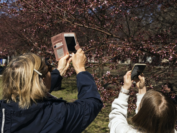People took photos of budding cherry blossoms in Roihuvuori, Helsinki, on Saturday, 11 May 2024. This week will bring a noticeable change in weather, with forecasts indicating that the mercury could climb as high as 25°C by the midway point of the week. (Roni Rekomaa – Lehtikuva)