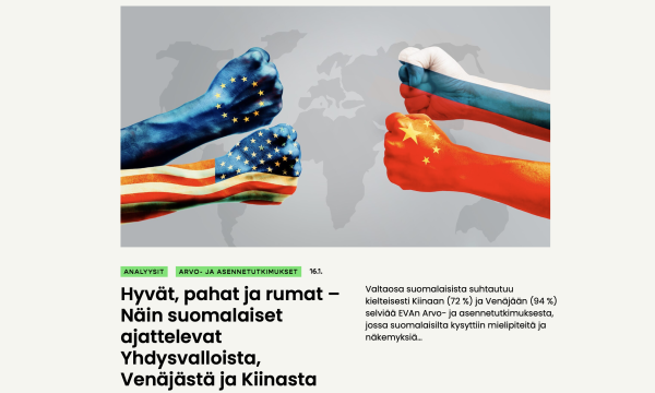 EVA published the survey titled “The Good, the Bad, and the Ugly – How Finns Think About the United States, Russia, and China.” Leading the report with: “A majority of Finns view China (72%) and Russia (94%) negatively, according to EVA’s Values and Attitudes Survey, which asked Finns about their opinions and views on the United States, China, and eight other significant countries in world politics.”