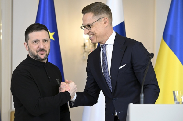 Ukrainian President Volodymyr Zelensky (L) and Finnish President Alexander Stubb react at the end of their joint press conference at the Presidential Palace in Helsinki, Finland, on March 19, 2025. President Zelensky and First Lady Zelenska are on an official visit to Finland. Lehtikuva