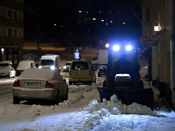 A snow-plough vehicle cleared snow off the pavement in Helsinki on Monday, 16 December 2024. Weather in the Finnish capital region is forecast to vary noticeably in the coming days, with rains occurring roughly every other day and temperatures bouncing on both sides of the freezing point. (Emmi Korhonen – Lehtikuva)