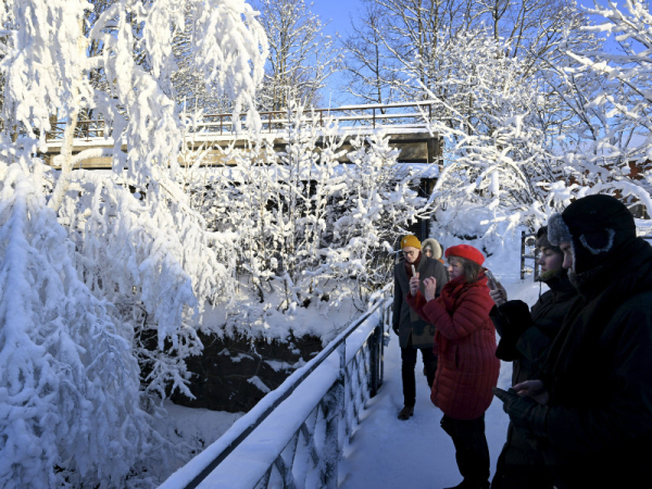 People took out their smartphones to capture the chilly and sunny weather at the Vanhankaupunginkoski rapids in Helsinki on 6 January 2023. This week is forecast to bring a noticeable change in weather in most parts of Finland, with the temperature set to rise from well under -20°C to slightly over 0°C. (Markku Ulander – Lehtikuva)