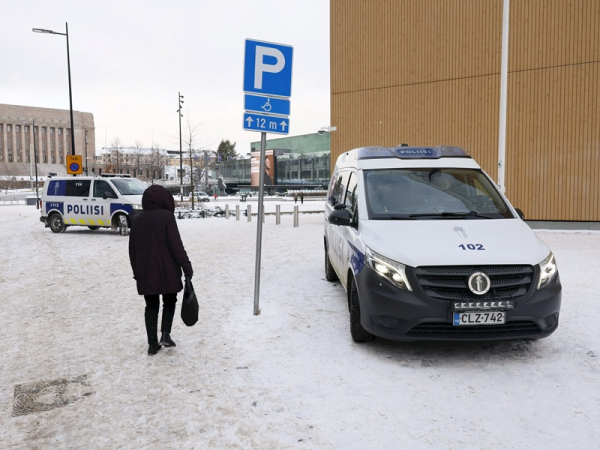 Police vans outside Oodi Central Library in Helsinki on 6 January 2025. Police in Finland have received around 50 reports of offences where the or one of the suspects is a person who entered the country across the eastern border since the second half of 2023, according to information obtained from the National Bureau of Investigation (KRP) by YLE. (Roni Rekomaa – Lehtikuva)