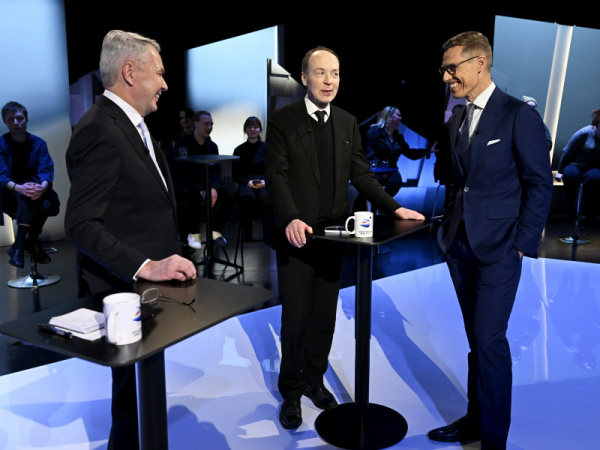 Presidential candidates Pekka Haavisto (Greens), Jussi Halla-aho (PS) and Alexander Stubb (NCP) chatted before an election debate broadcast live by YLE on Thursday, 25 January 2024. The latest opinion poll conducted for the public broadcasting company suggests that changes in the pecking order between the three leading candidates remain possible. (Vesa Moilanen – Lehtikuva)