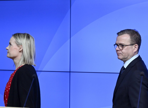 Minister of Finance Riikka Purra (PS) and Prime Minister Petteri Orpo (NCP) left a media availability ahead of the government’s framework session in Helsinki on 15 April 2024. Purra’s Finns Party and Orpo’s National Coalition both recorded modest gains in the latest opinion poll commissioned by YLE. (Heikki Saukkomaa – Lehtikuva)