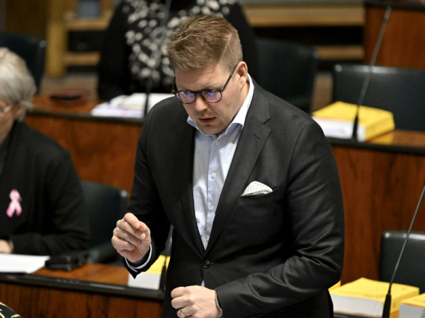 Antti Lindtman, the chairperson of the Social Democratic Party, gestured during a plenary session in parliament on 12 October 2023. The Social Democratic Party has seen a surge in support in recent weeks, presumably as a result of ongoing debate over the government’s labour market reforms and spending cuts, suggests the latest opinion poll by YLE. (Vesa Moilanen – Lehtikuva)