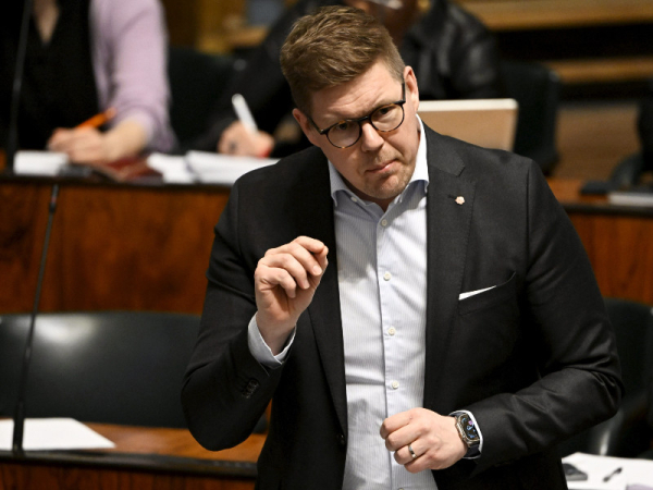 Antti Lindtman, the chairperson of the Social Democrats, gestured in the session hall of the Parliament House in Helsinki on 12 March 2024. The Social Democrats has seen an almost two-percentage-point increase in support since mid-March, according to the latest opinion poll commissioned by YLE. (Vesa Moilanen – Lehtikuva)